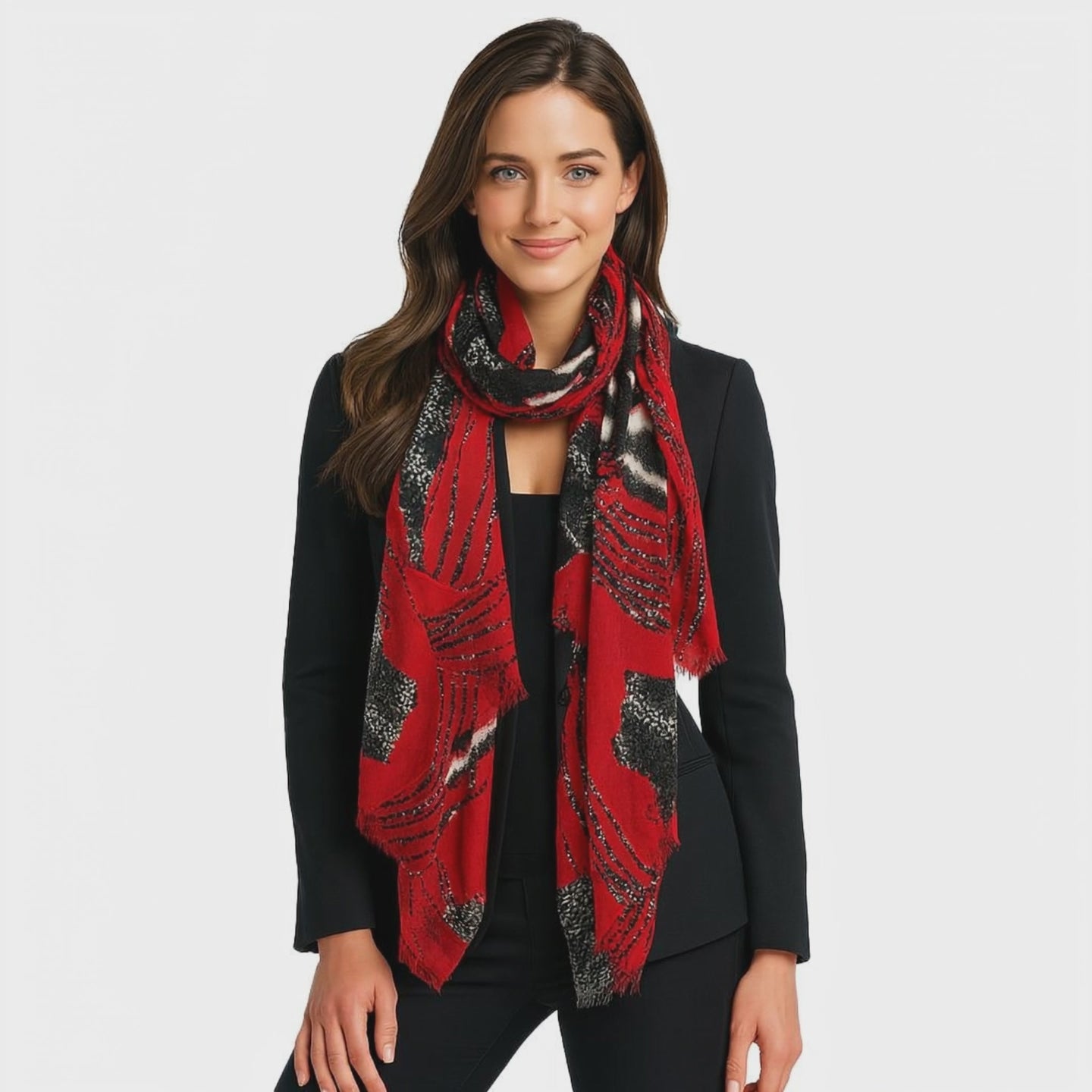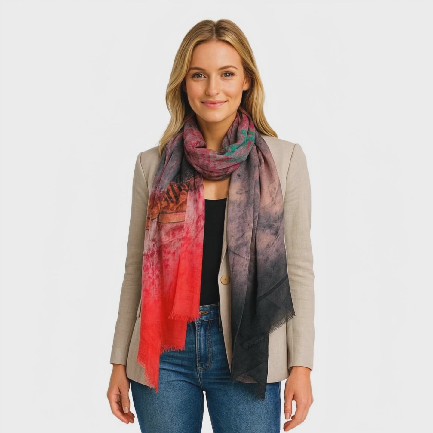 An art-driven scarf that blends visual impact with a soft, wearable drape.