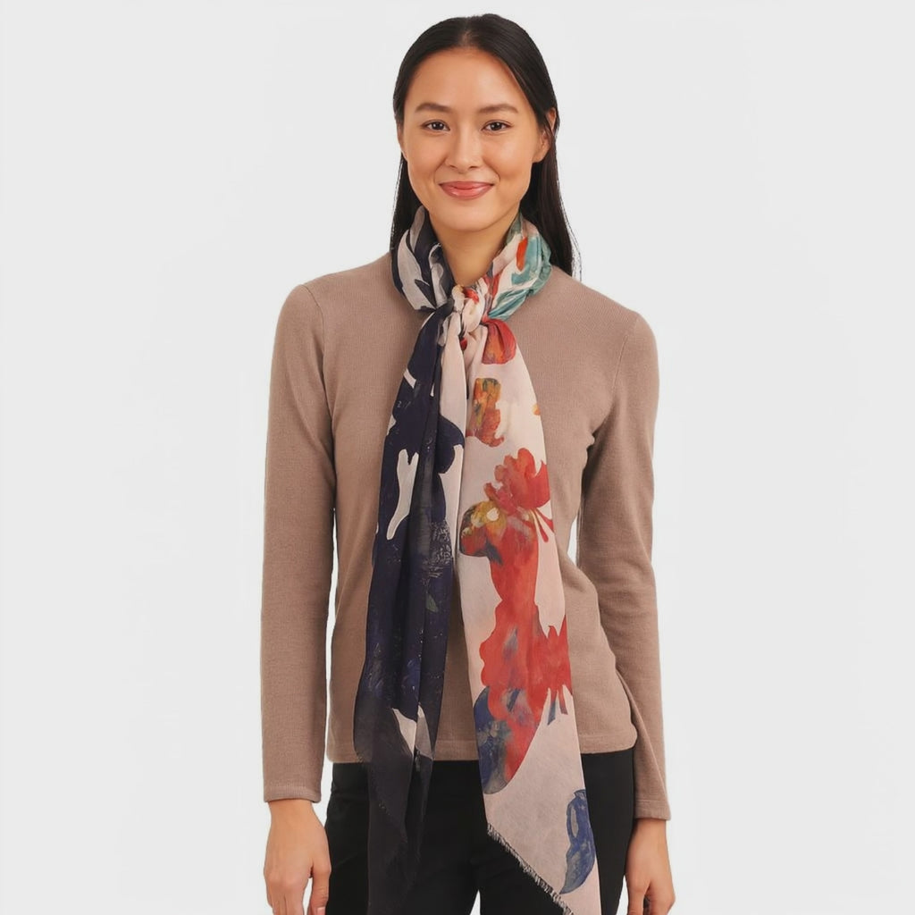 Featuring butterflies in shades of indigo and denim, this micromodal scarf balances rustic charm with modern artistry. A versatile piece for casual or elevated looks.