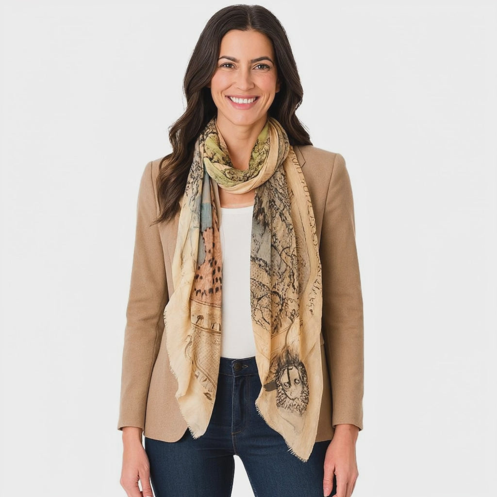 This micromodal scarf features a Renaissance-inspired world map bordered with cherubs and maritime motifs. A statement piece for dreamers and explorers alike.