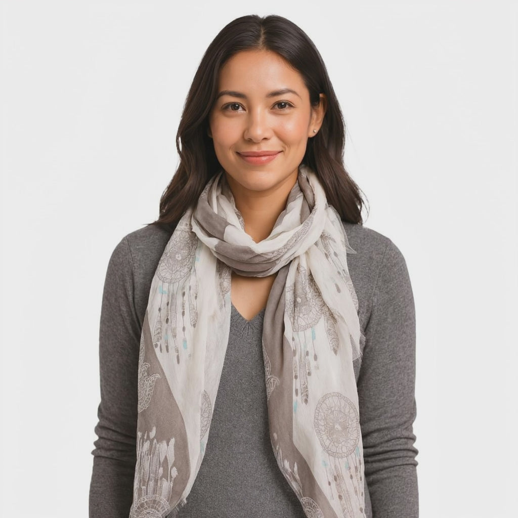 This micromodal scarf showcases intricate dreamcatcher motifs with soft neutral tones. A wearable symbol of protection and positivity.
