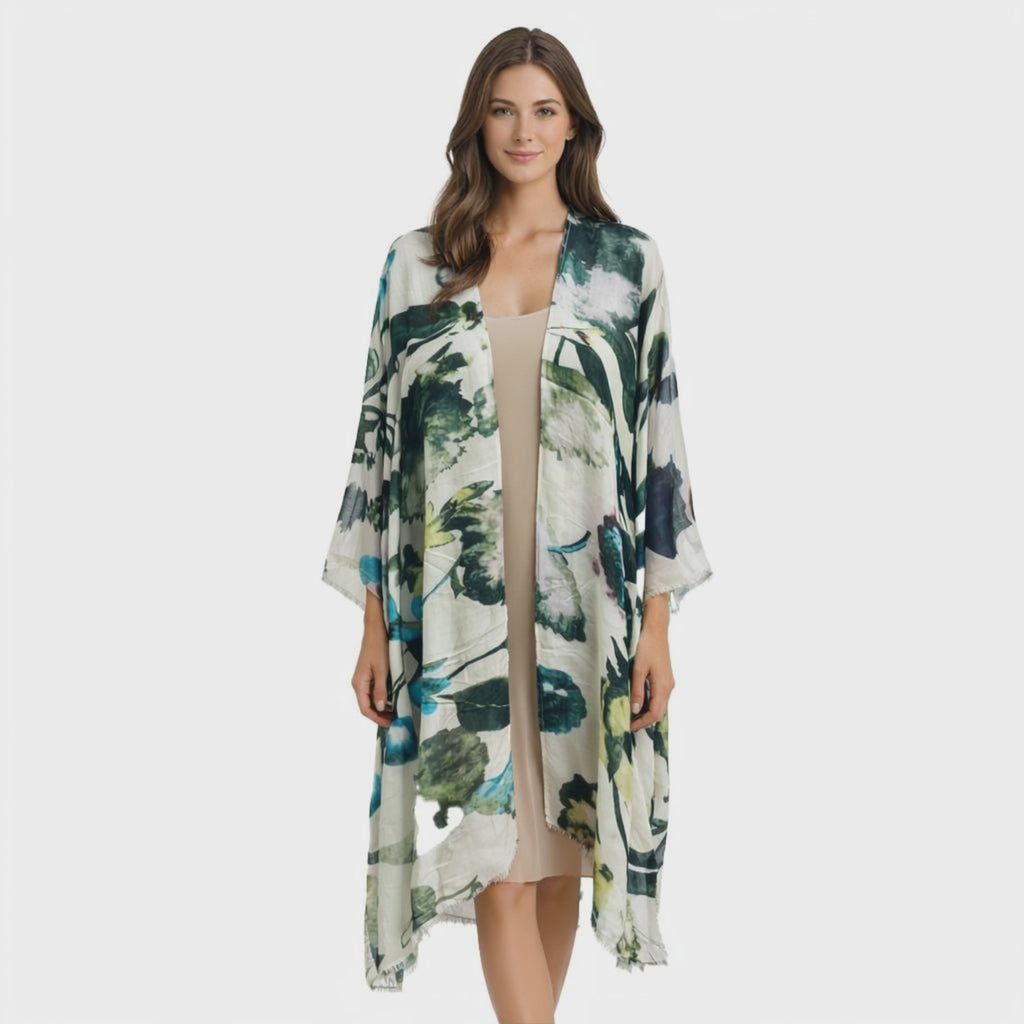 The Floral Dip Kimono is crafted from our existing scarf fabric and made in Santa Barbara, California, preserving the same soft hand, fluid drape, and visual richness retailers already trust. The knee-length cut and open-front design create an easy, flattering silhouette that layers effortlessly over dresses, denim, or resort wear.