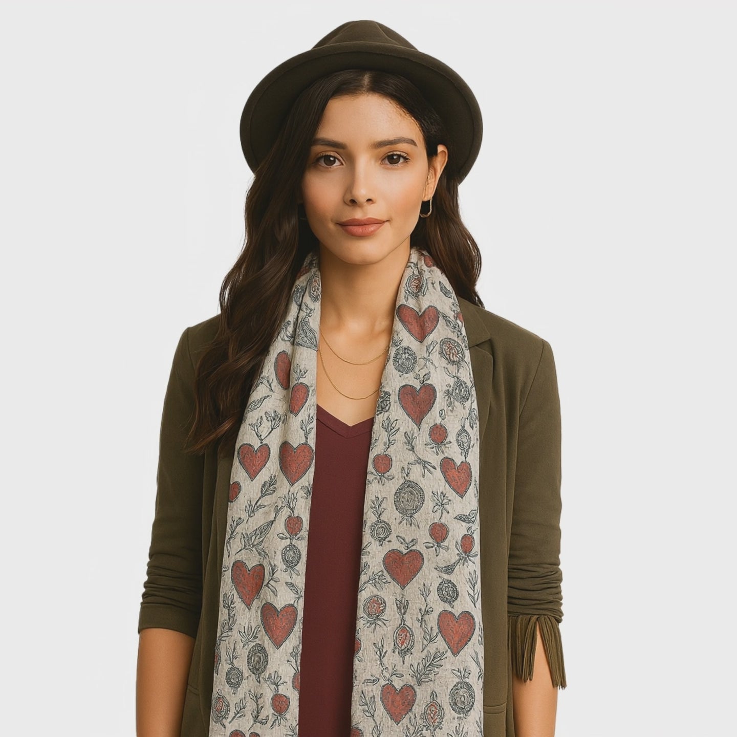 A charming, playful micromodal scarf scattered with hearts, perfume bottles, and doves. A joyful nod to Paris as the city of romance and perfume.