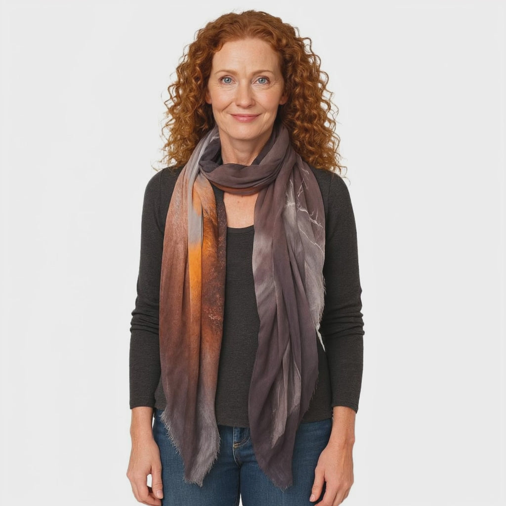 An art-driven scarf that blends visual impact with a soft, wearable drape.
