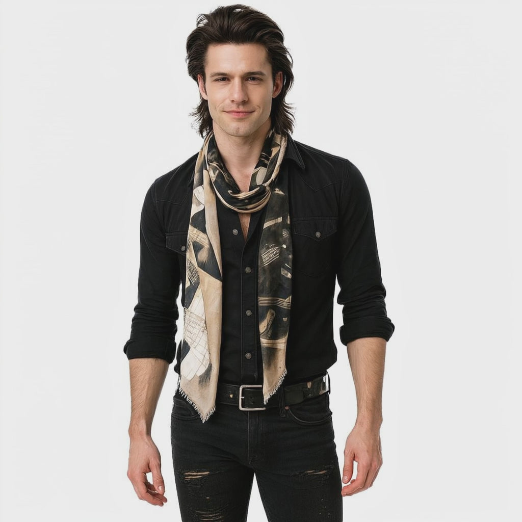 Channeling the soul of live performance, the Nashville Guitar Scarf combines silky fluidity with artistic grit. Its tonal design adds instant charisma to modern menswear. Crafted from silk & micromodal.